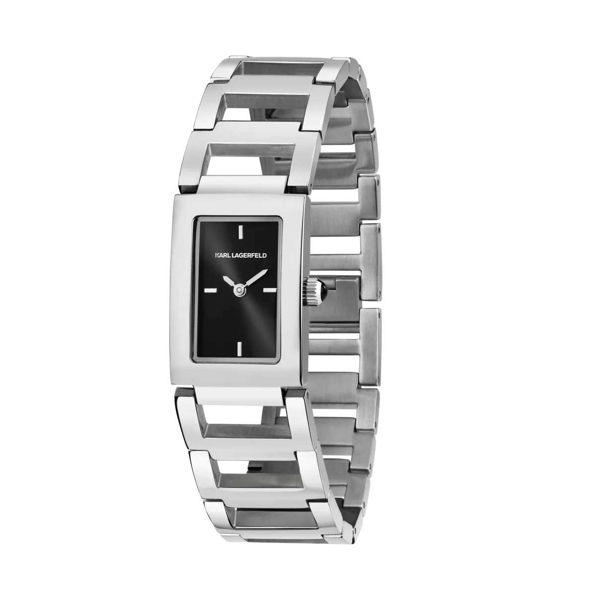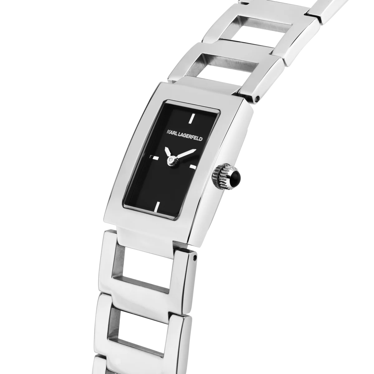 - Циферблат: черен sunray, правоъгълен, с минималистични индексни маркери и лого Karl Lagerfeld.