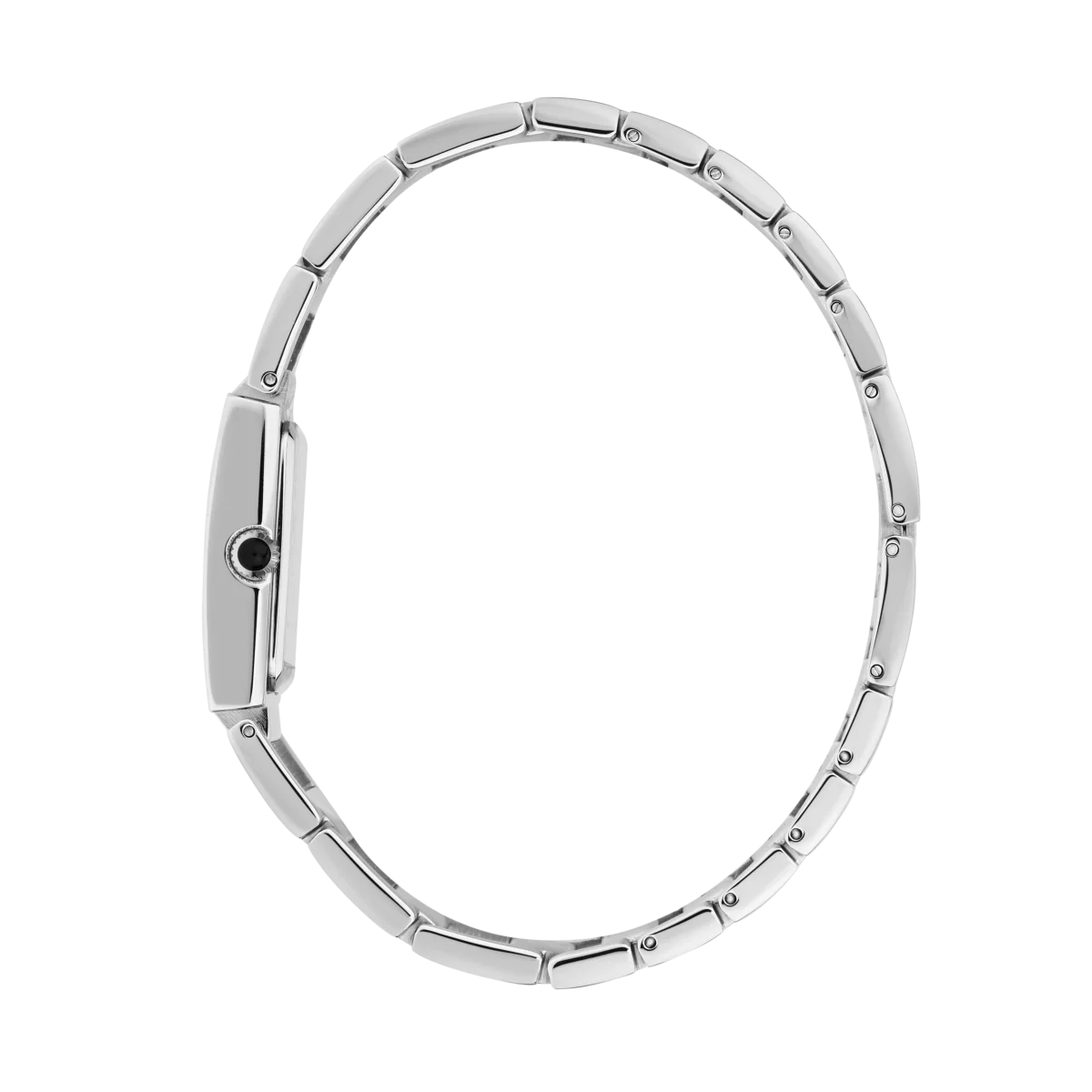 Този елегантен дамски часовник Karl Lagerfeld Paris превръща минимализма в изявление. Правоъгълният черен циферблат в комбинация със сребристата верижка тип гривна подчертава китката като фино бижу, а чистите линии носят характерния градски стил на марката.