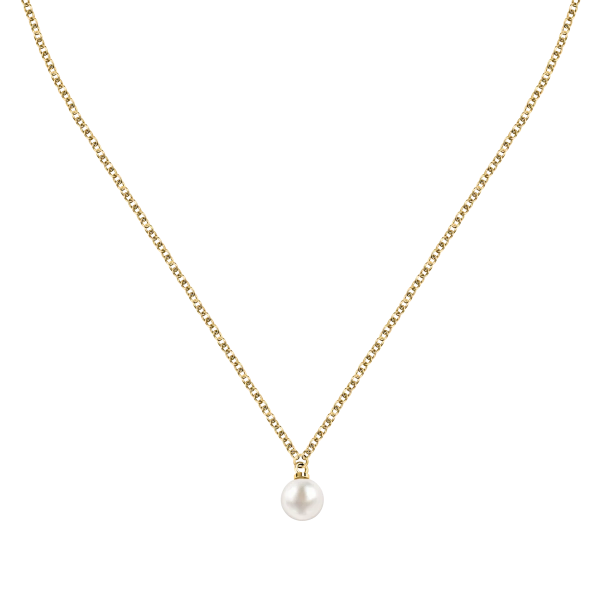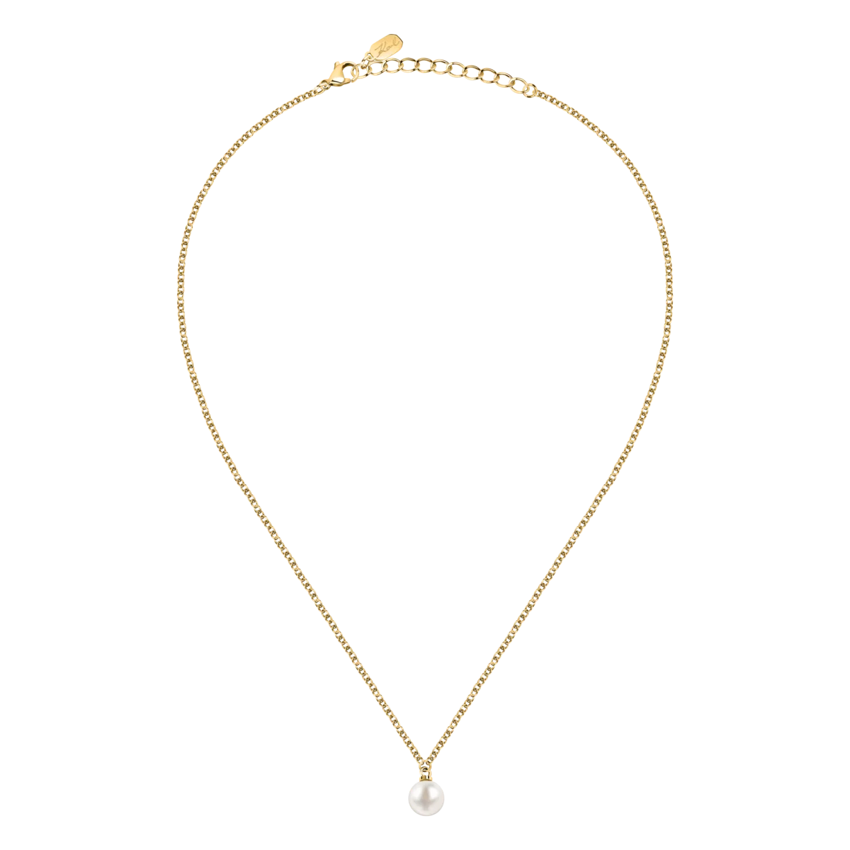Дамското колие Karl Lagerfeld Pearl KLAYR18 е изчистен акцент, който съчетава класическа перла и модерна златиста верижка. Финото жълтозлатисто покритие придава топъл блясък, а единичната бяла перла отпред пада елегантно в центъра на деколтето.