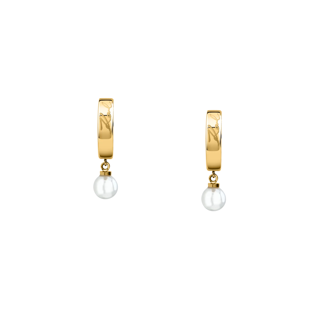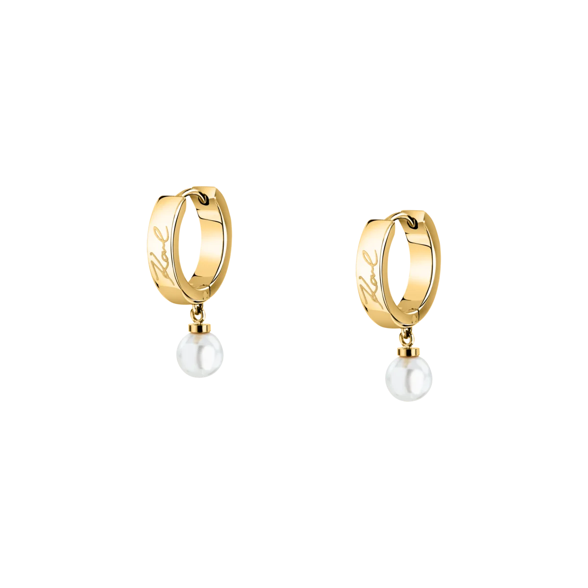 Дамски обеци Karl Lagerfeld Pearl, златисти халки с подпис Karl и бяла перла – страничен изглед, модел KLAYR15