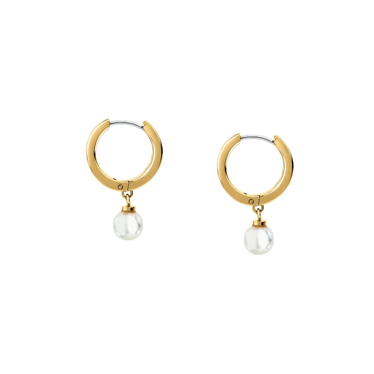 Обеци са изработени от висококачествена неръждаема стомана 316L с PVD жълтозлатисто покритие, което осигурява наситен цвят и по-добра устойчивост на износване от стандартна позлата. Висящият елемент е бяла синтетична shell перла – гладка, сияйна и подходяща за ежедневно носене. Гладката повърхност и закръгленият профил на халката са приятни за носене и не дразнят кожата.