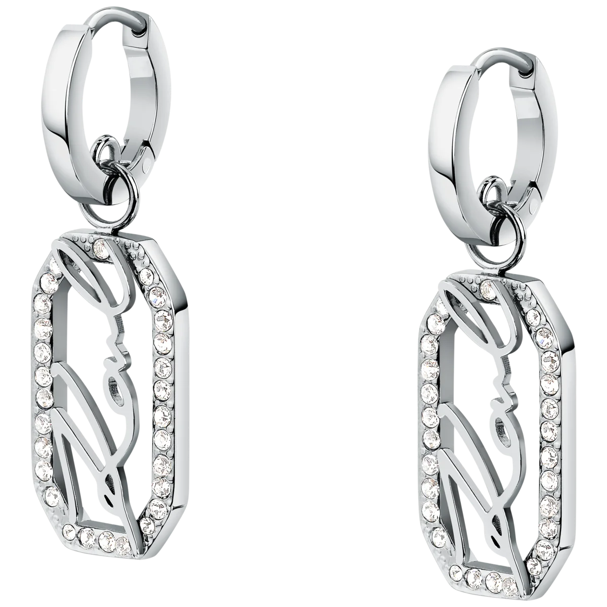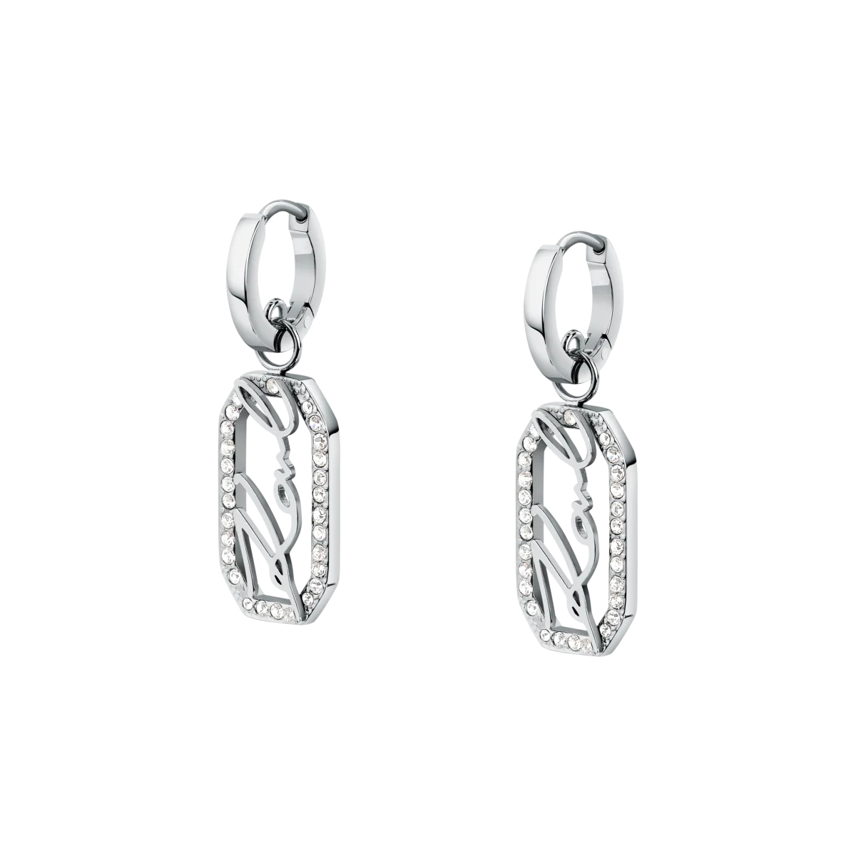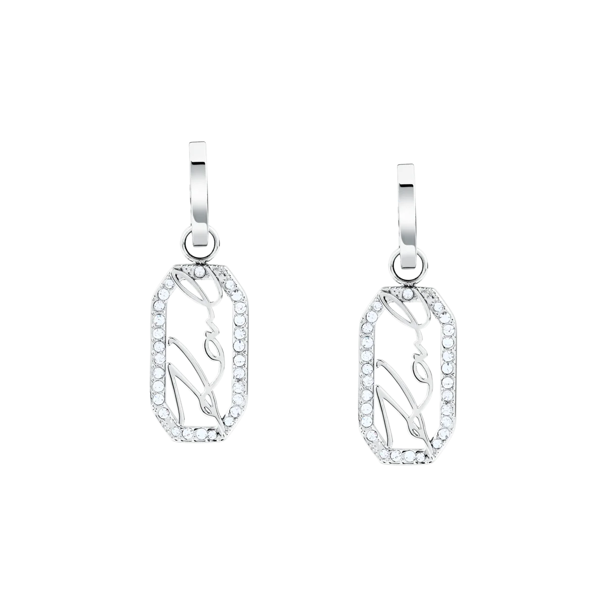 Детайлен изглед на висящи обеци с кристали – блестяща рамка и релефен подпис Karl Lagerfeld.