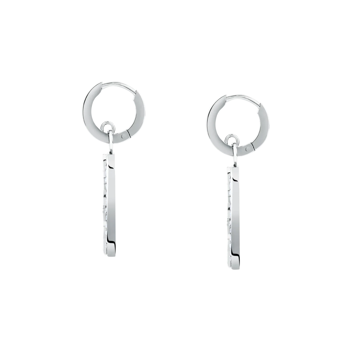 Висящите обеци с кристали от колекция CRYSTALS на Karl Lagerfeld са създадени за жени, които обичат модния блясък с дизайнерски характер. Моделът комбинира малки стоманени халки с правоъгълни, леко издължени висулки с ажурен силует и стилизирания надпис „Karl“ в центъра – детайл, който веднага издава емблематичния почерк на бранда. Обеците са изработени от висококачествена стомана в сребрист стоманен цвят и са богато декорирани с прозрачни кристали по рамката на всяка висулка. Това дава силен, но изискан блясък при движение на главата и прави модела подходящ както за ежедневието, така и за по-специални поводи. Общата дължина е около 3,3 cm – достатъчно, за да подчертаят лицето, без да бъдат прекалено масивни. Халките са с удобно щракващо закопчаване, което държи обеците стабилно на ухото и осигурява комфорт през целия ден. Чистите геометрични линии и кристалният блясък се комбинират прекрасно с изчистен бял t-shirt и дънки, но също толкова добре и с малка черна рокля или елегантен костюм. Това са модни дамски обеци с кристали, които добавят „подписа“ Karl Lagerfeld към всеки аутфит и са чудесен избор и като подарък за почитателка на марката.