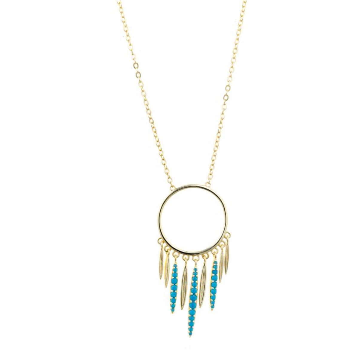 Inspirat de stilul boem, colierul feminin din argint cu acoperire PVD de aur de 18K și elemente suspendate în culoarea turcoaz | Salvatore Plata MARMARA combină eleganța cu etno chic. Fabricat din argint 925 cu acoperire PVD de aur de 18K, colierul are un design rafinat cu un element rotund, din care se coboară elemente delicate suspendate în formă de lacrimi și pene, decorate cu mărgele turcoaz.