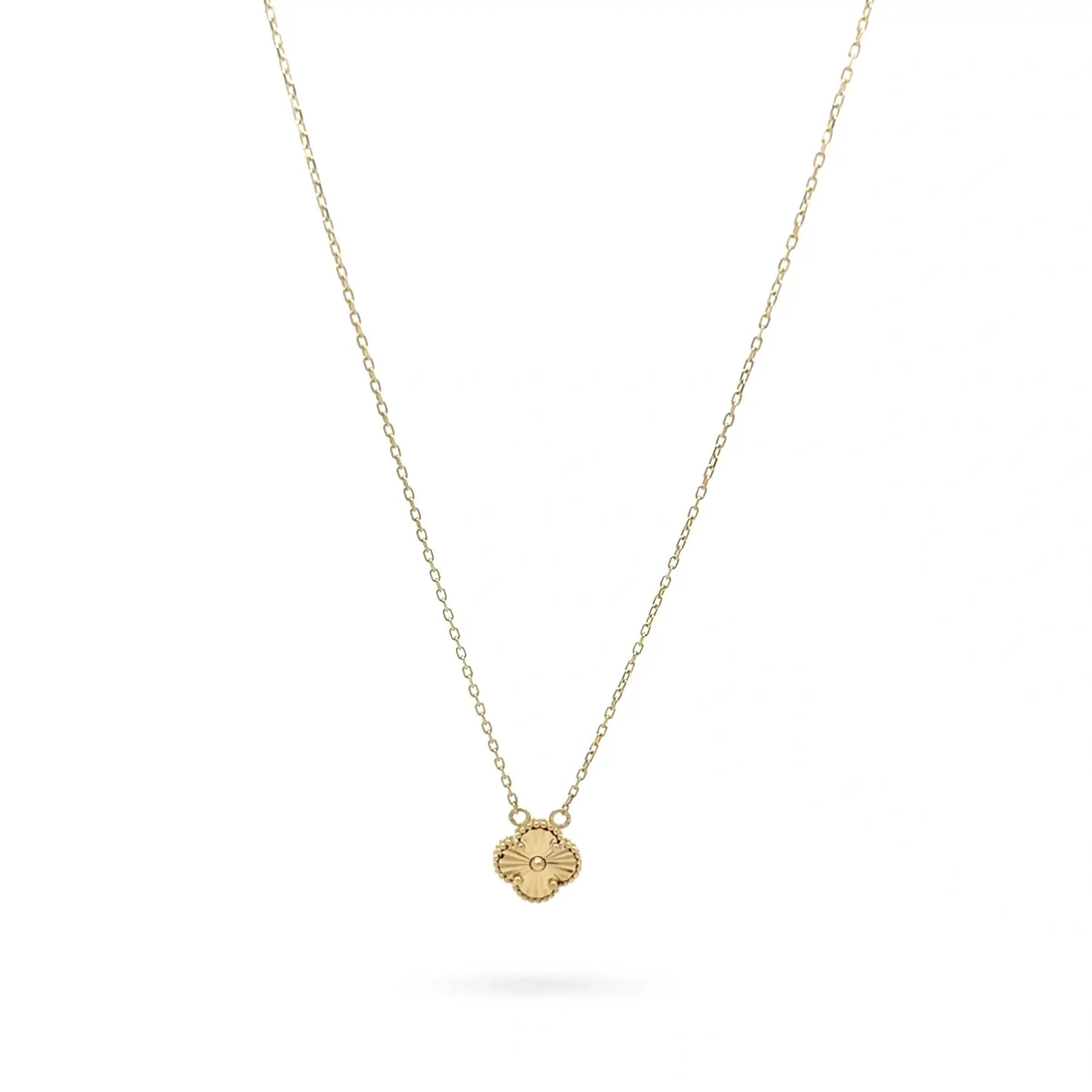 Колие от жълто злато 14K с гравирана детелина – елегантен аксесоар.
