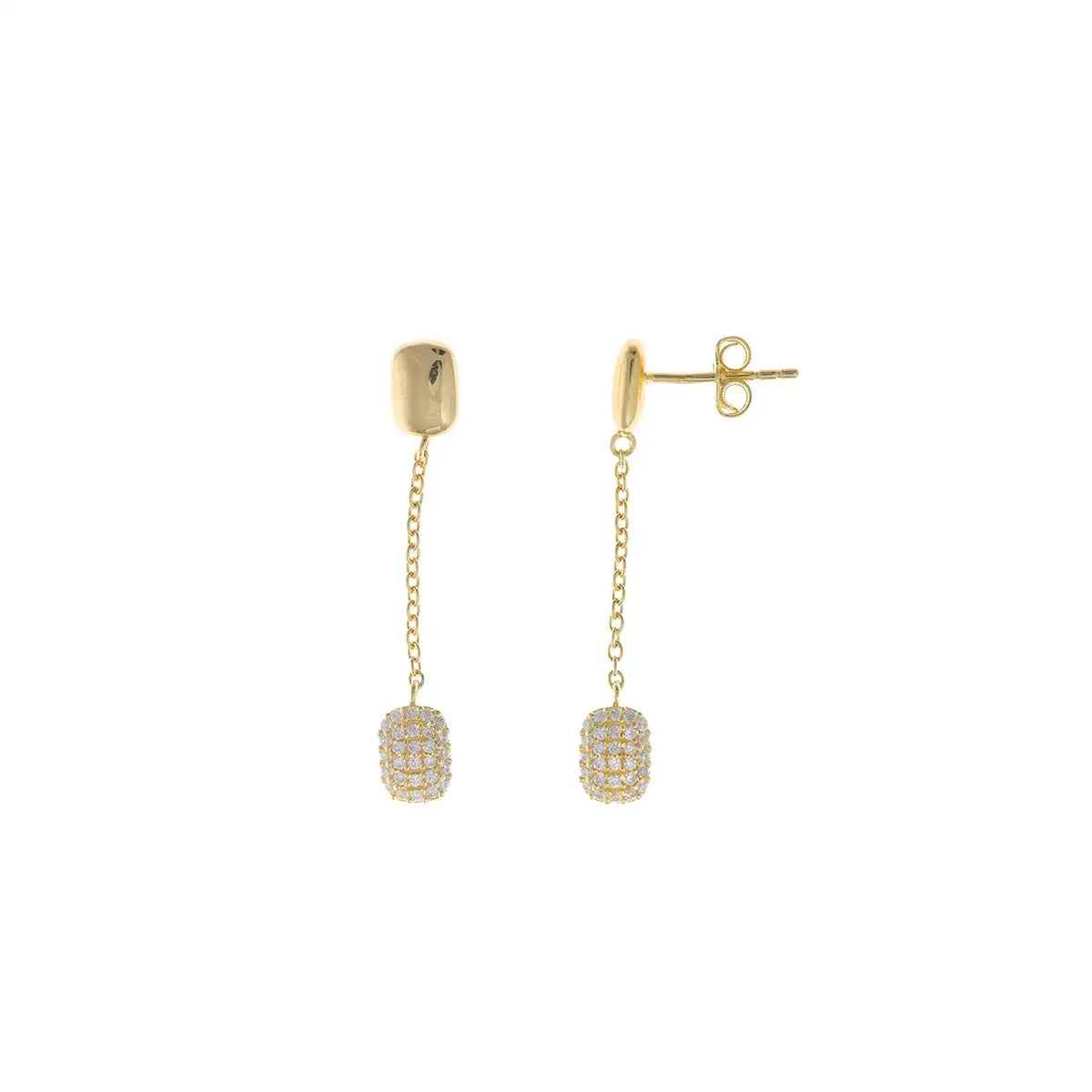 Cercei eleganți suspendați din argint 925 cu placare aurie, cu partea superioară netedă și un element micro-incrustat cu zirconii albe – o combinație de minimalism și strălucire.