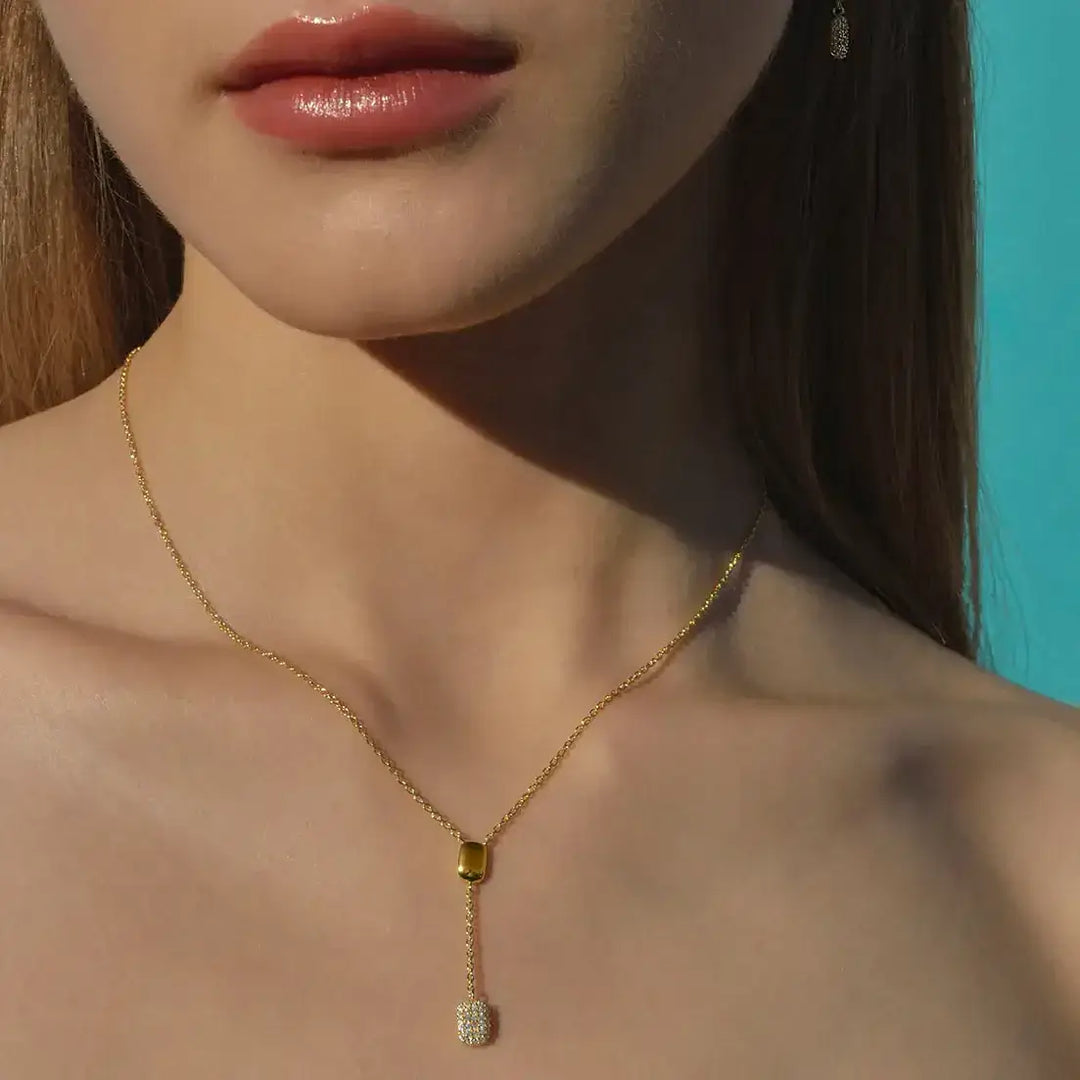 Модел носи позлатено колие от сребро с правоъгълен медальон и бели цирконии от колекция Heritiere