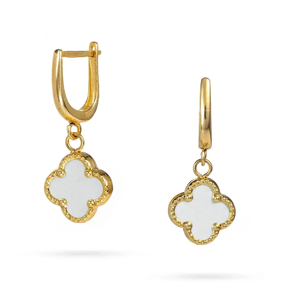 Висящи златни обеци с детелина от бял оникс и английска закопчалка